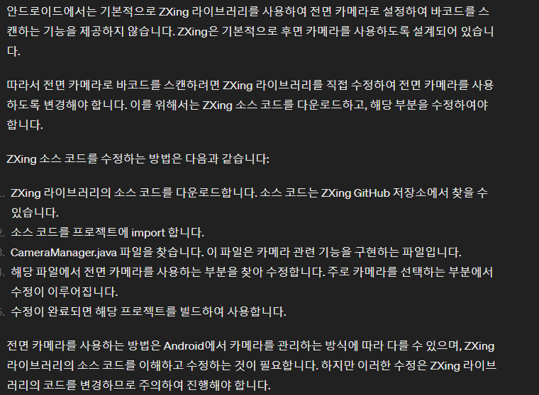 기존 프로그램에서 zxing 라이브러리 사용하여 바코드 스캔 하여 진행하는 프로세스가 있다.