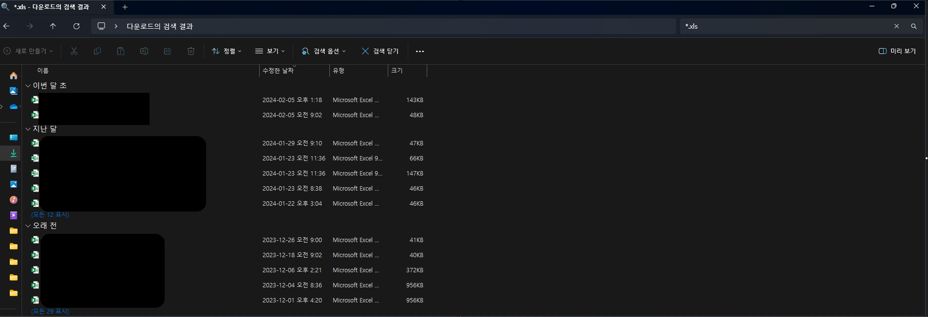 검색 창에 *.xls (엑셀), *.pdf 등등 이렇게 확장자 입력 해주면 검색된다.