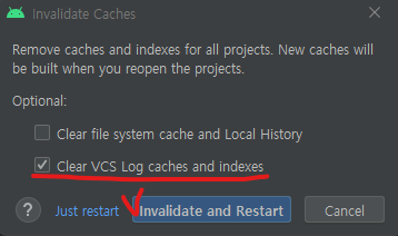 2. 기본으로 Clear VCS Log cashes and indexes가 선택 되어 있어서 그대로 Invalidate and Restart 클릭