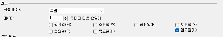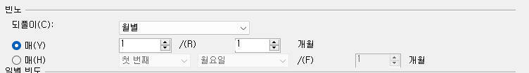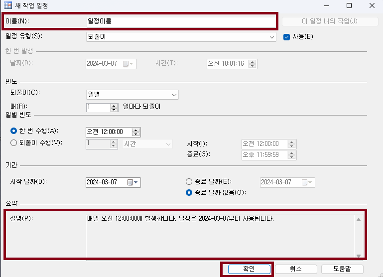 이름 작성 후 -> 빈도 수 / 기간 등 설정 후 -> 아래 설명 부분 보며 최종 스케줄 확인 후 -> 확인 클릭