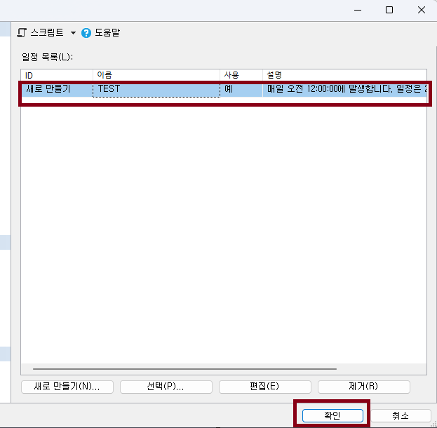 9. 일정목록에 생성된 스케줄 확인 후 -> 확인 클릭