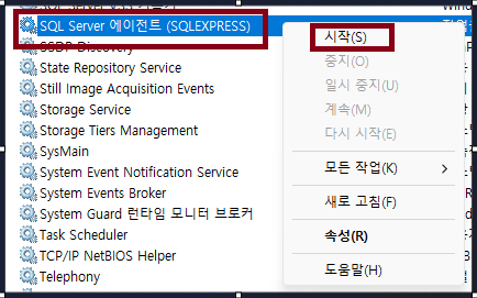 WINDOWS 검색 -> 서비스 -> SQL SERVER 찾아 -> 우클릭 -> 시작