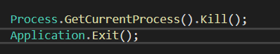 Process.GetCurrentProcess().kill() 해당 코드 추가 --> 지금 실행 중인 모든 프로세스 종료