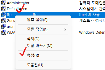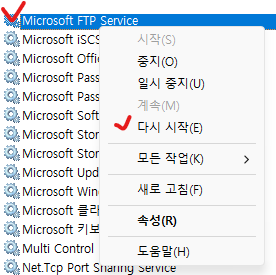 -> 인바운드 규칙 -> 아래의 그림에 선택되어 있는 ftp 관련 규칙 선택하여 우클릭 후 규칙 사용 선택