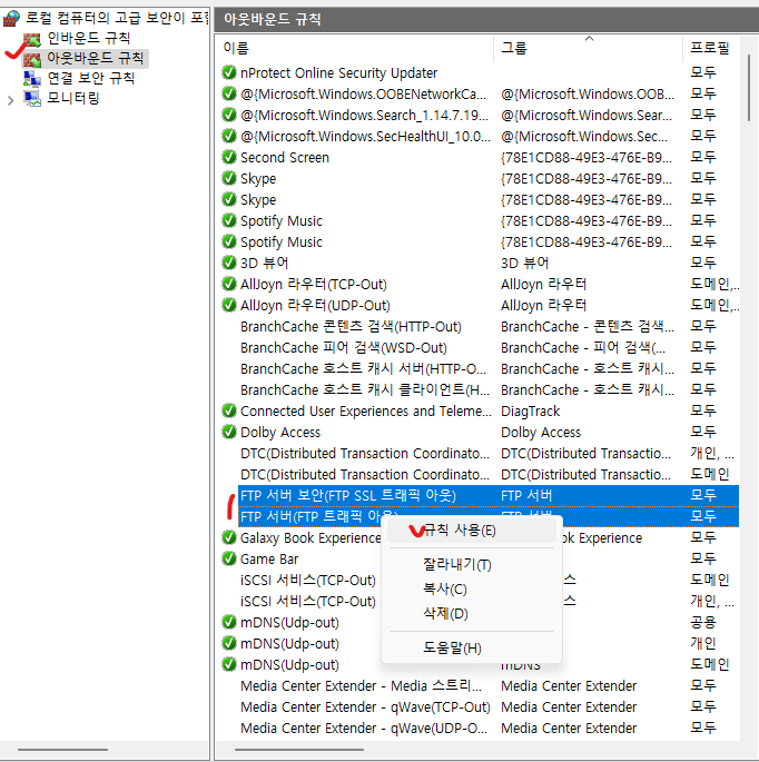 아웃바운드 규칙 -> 아래의 그림에 선택되어 있는 ftp 관련 규칙 선택하여 우클릭 후 규칙 사용 선택
