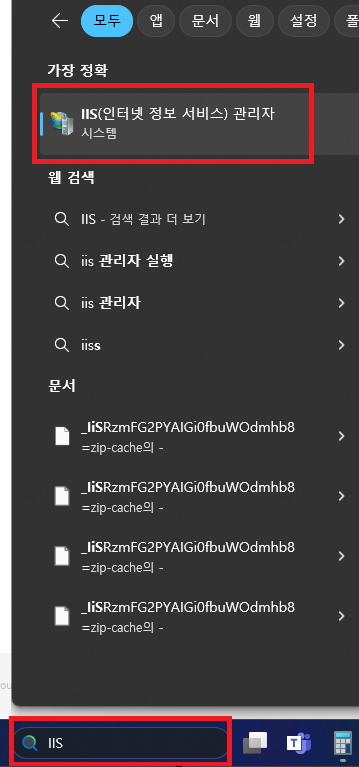 윈도우 키 -> 검색 창에 'II' 라고 입력 -> IIS (인터넷 정보 서비스) 관리자 선택