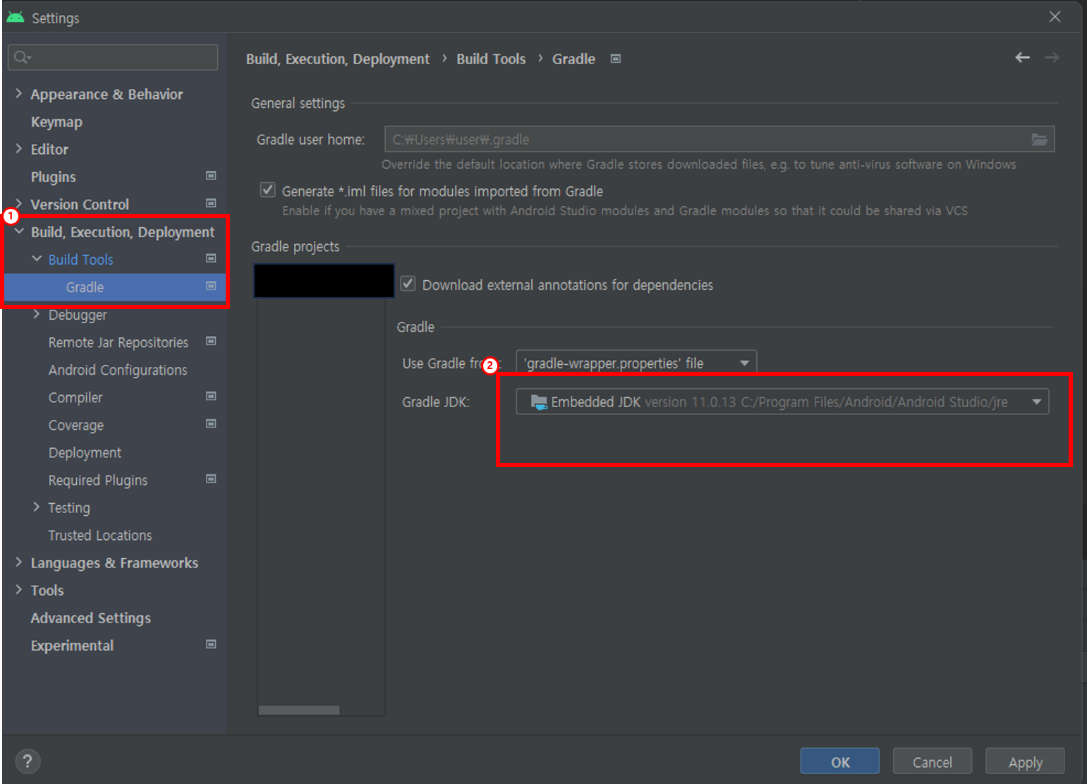 Gradle JDK -> Embedded JDK로 선택 후 ok