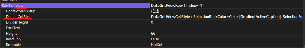 RowTemplate 의 하위 속성에 있는 DefaultCellStyle을 변경해 주니 적용됐다.