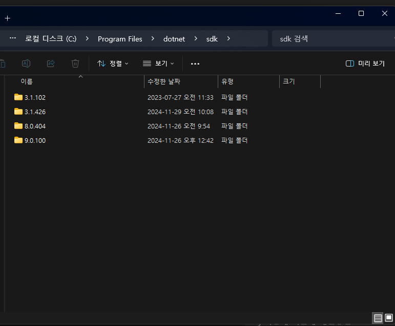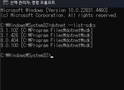 커맨드 창에 다시 dotnet --list-sdks 치니까 아래와 같이 설치된 SDK 목록들이 쭉 나온다...